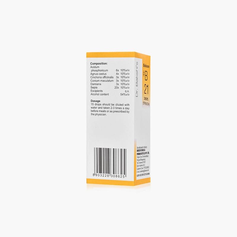BAKSON #B 21 Drops is a homeopathic medicine for premature ejaculation. It is a homeopathic formulation to treat sexual asthenia, nervous exhaustion, over excitement, and general debility associated with spermatorrhoea in men.