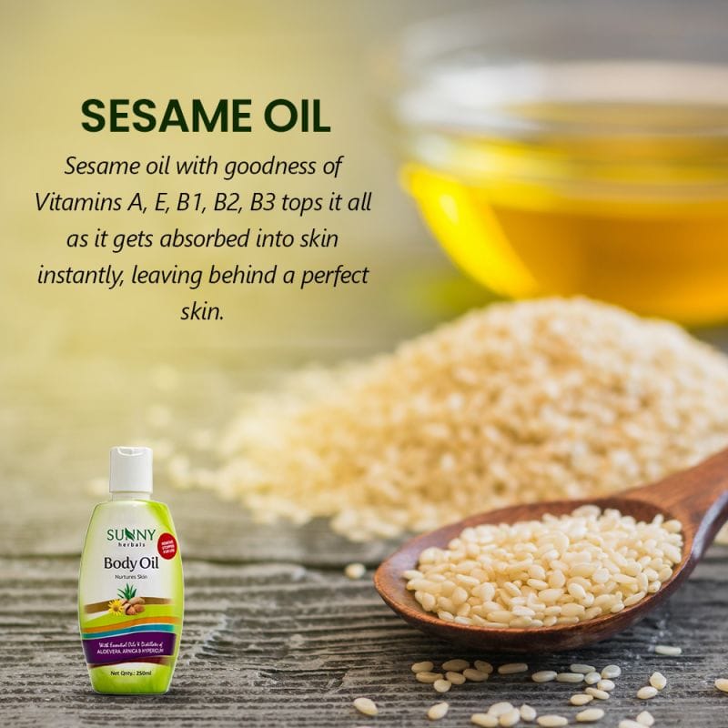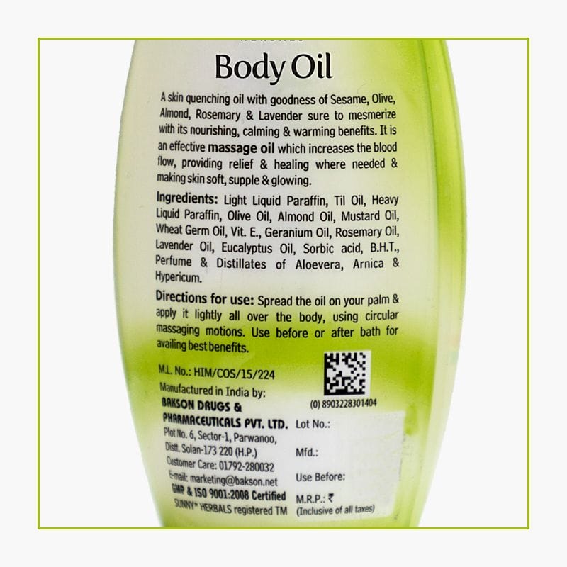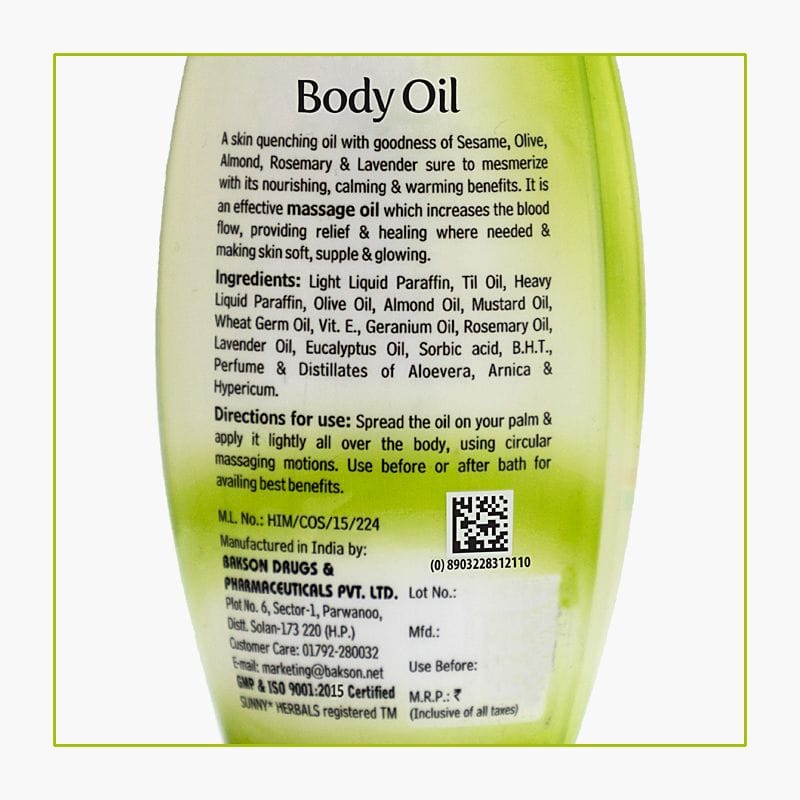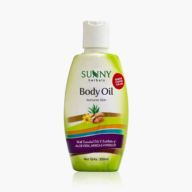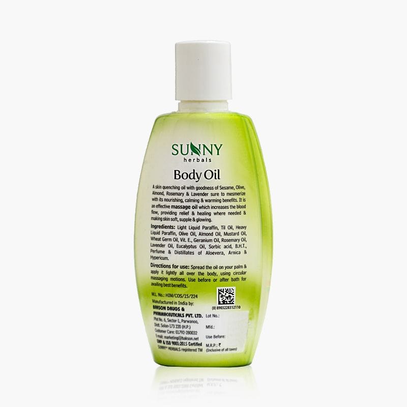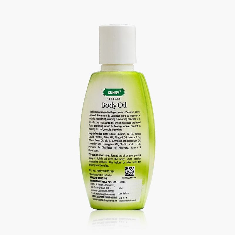 | Sunny herbals Body Oil is power packed with a blend of many natural oils to give you a perfect body massage. Sesame oil with goodness of Vitamins A, E, B1, B2, B3 tops it all as it gets absorbed into skin instantly, leaving behind a perfect skin. Olive oil helps keep dry skin at bay. Almond oil with Lavendar and Rosemary oil relieves stress and eases nerves. They even have antiseptic properties to keep skin healthy. Ingredients: Light Liquid Paraffin, Til Oil, Canola Oil, Mustard Oil, Olive Oil, Almond Oil, Wheat Germ Oil, Vit. E., Geranium Oil, Rosemary Oil, Lavender Oil, Eucalyptus Oil, Sorbic acid, B.H.T., Perfume & Distillates of Aloevera, Arnica & Hypericum. |