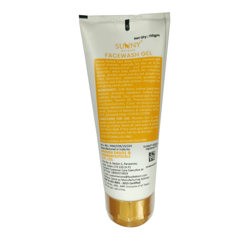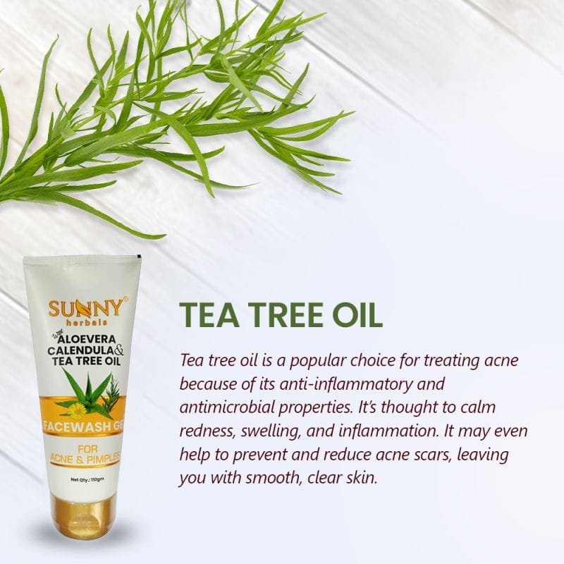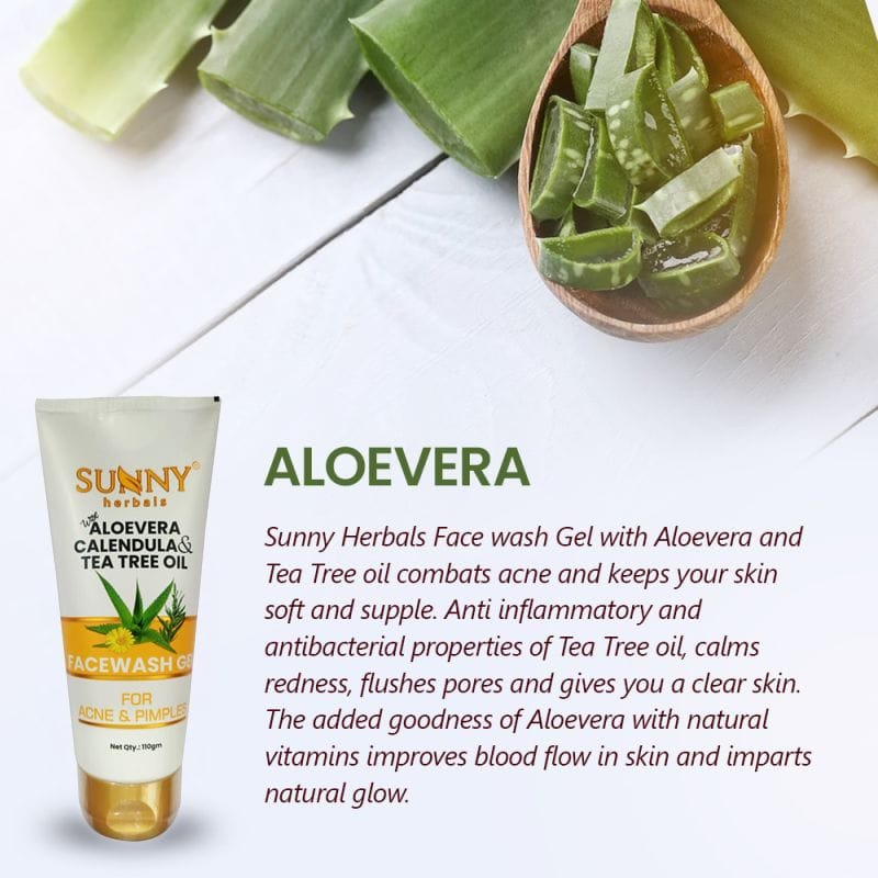 | Sunny Herbals Face wash Gel with Aloevera and Tea Tree oil combats acne and keeps your skin soft and supple. Anti inflammatory and antibacterial properties of Tea Tree oil, calms redness, flushes pores and gives you a clear skin. The added goodness of Aloevera with natural vitamins improves blood flow in skin and imparts natural glow. Tea tree oil is a popular choice for treating acne because of its anti-inflammatory and antimicrobial properties. It’s thought to calm redness, swelling, and inflammation. It may even help to prevent and reduce acne scars, leaving you with smooth, clear skin. Ingredients: D.M. Water, Sodium Lauryl ether sulphate, Acrylates copolymer, Polyquaternium 7, Coco Amidopropyl betaine, Sodium Lauryl sulphate (liquid), Coco diethanolamide, Glycerine, Tween 20, Triethenolamine, Perfume, Melaleuca alternifolia (Tea Tree) leaf oil beads, Extracts of Aloevera & Calendula, M.P.S., P.P.S., CI19140, CI15985. |