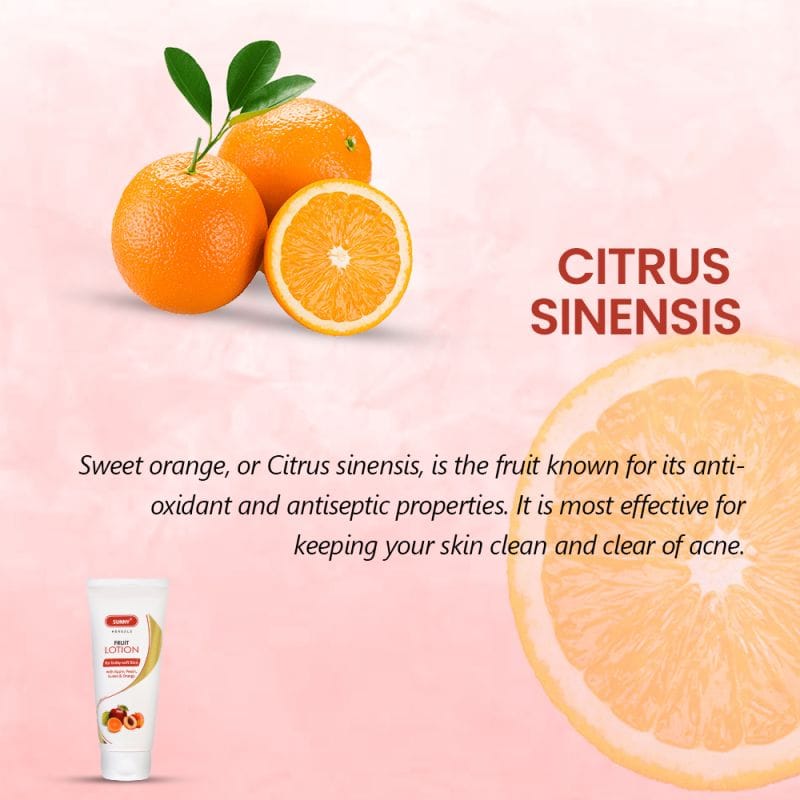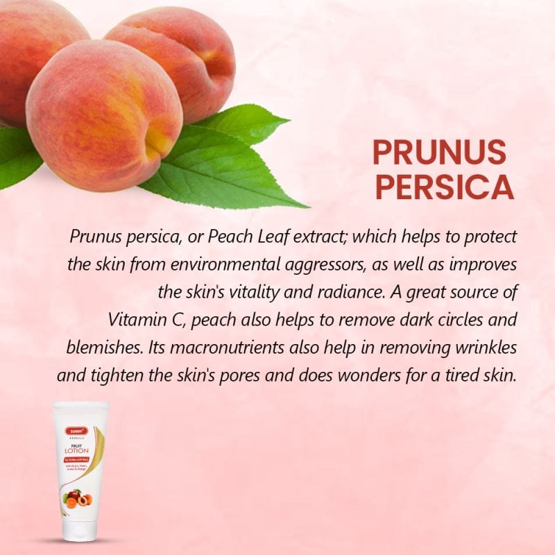 | Sunny Herbals Fruit Lotion is in an easy to use tube packaging for giving you a fresh look everyday. It is a blend of extracts of many fruits along with Kokum Butter. Prunus persica, or Peach Leaf extract; helps to protect the skin from environmental aggressors, as well as improves the skin’s vitality and radiance. A great source of Vitamin C, peach also helps to remove dark circles and blemishes. Its macronutrients also help in removing wrinkles and tighten the skin’s pores and does wonders for a tired skin. Sweet orange, or Citrus sinensis, is the fruit known for its antioxidant and antiseptic properties. It is most effective for keeping your skin clean and clear of acne. Psidum guajava fruit extract is a great source of many bioactive antioxidants, including gallic acid, catechin, chlorogenic acid, rutin, quercetin, tocopherol, beta-carotene and lycopene. The leaf extract is also a good source of beneficial compounds for healthy skin. Its antioxidants may protect your skin from damage, which can slow down its aging process, helping prevent wrinkles besides even keeping acne at bay. Ingredients: D.M. Water, L.L.P., Glyceryl stearate, PEG-100 stearate, Cyclopentasiloxane, Phenyltrimethicone, C12-15 Alkyl benzoate, Dimethicone crosspolymer, Isohexadecane, Distillates of Malus domestica, Prunus persica, Psidium guajava & Citrus sinensis, Shea butter, Aloe gum extract, Sodium Acrylate Copolymer, Mineral Oil, Trideceth-6, Cetostearyl alcohol, Potassium Cetyl phosphate, Carbomer, Methylisothiazolinone & Phenoxyethanol, Tocopheryl acetate, Perfume, CI15510. |